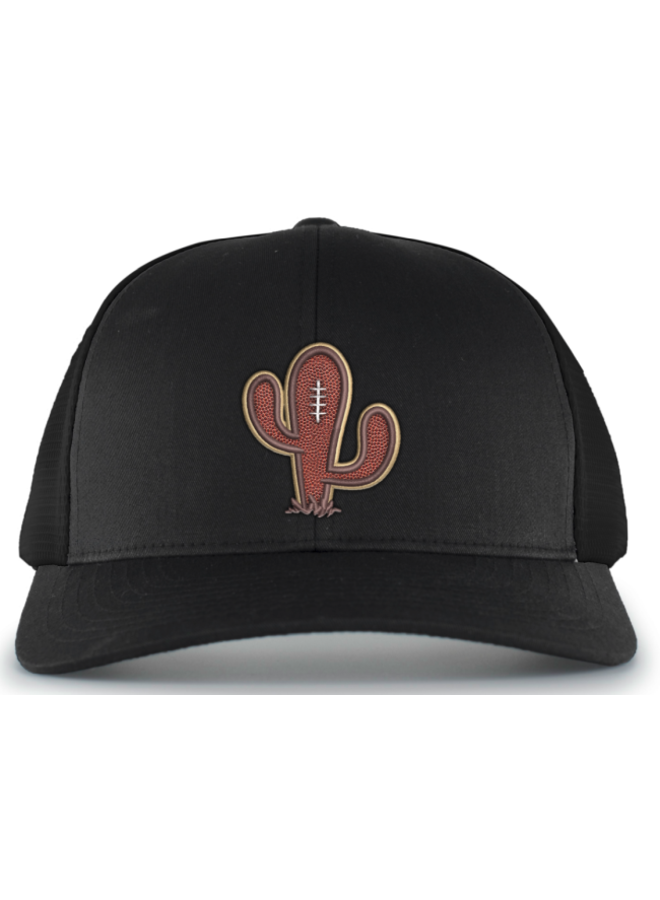 Black Trucker snapback mesh cap with real football leather material cactus on front. Gonzo “G” on the side.