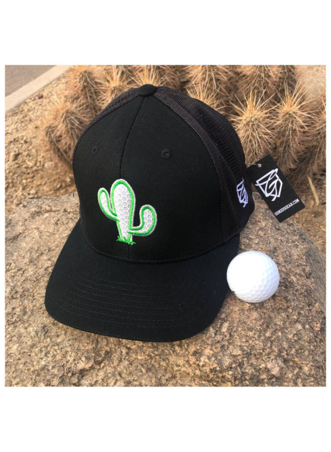 Black Trucker Flex Fit snapback mesh cap with golf ball texture cactus on front. Gonzo “G” on the side.