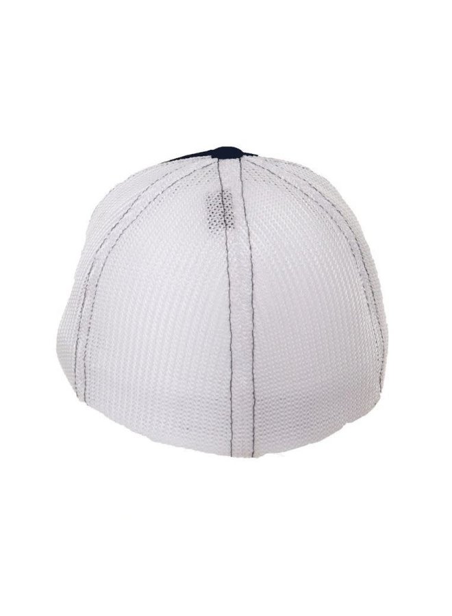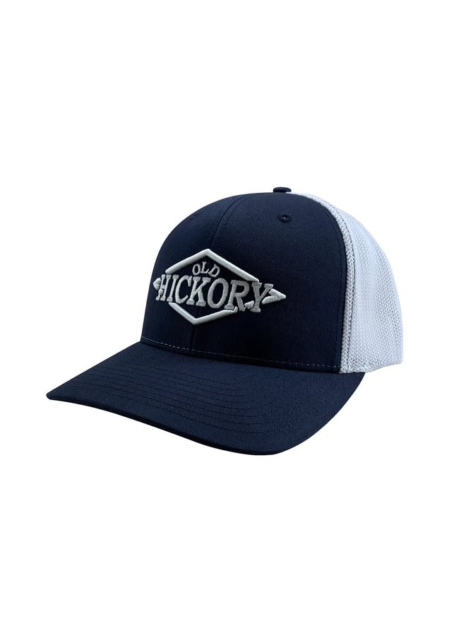 Stylish headwear from Old Hickory. These caps feature a navy bill and front panel with the Old Hickory logo embroidered on the front and white mesh FlexFit back. Available in a mid-pro crown flex fit design (available in S/M and L/XL).