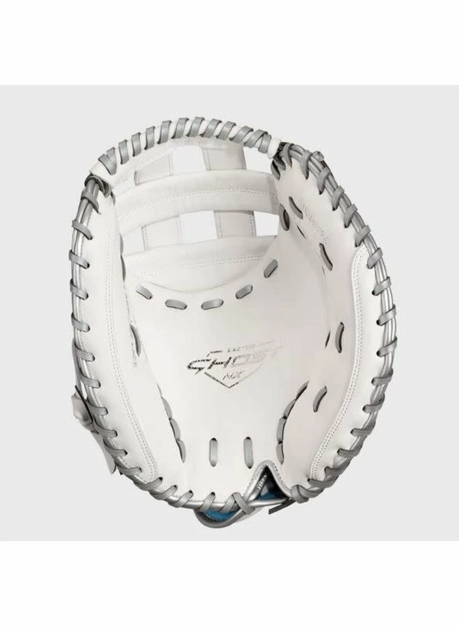 On the outside, the Game Ready Diamond Pro Steer leather and Flex Notch closure system make this glove super soft and easy to handle right away. The Quantum Closure System on the glove back ensures a perfect fit for every player, and the interior Ax Suede microfiber lining creates unmatched comfort and durability. Also, the striking white-and-blue colorway and professional-grade silver metallic rawhide lace are sure to turn heads.