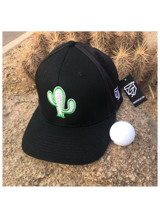 Black Trucker Flex Fit snapback mesh cap with golf ball texture cactus on front. Gonzo “G” on the side.