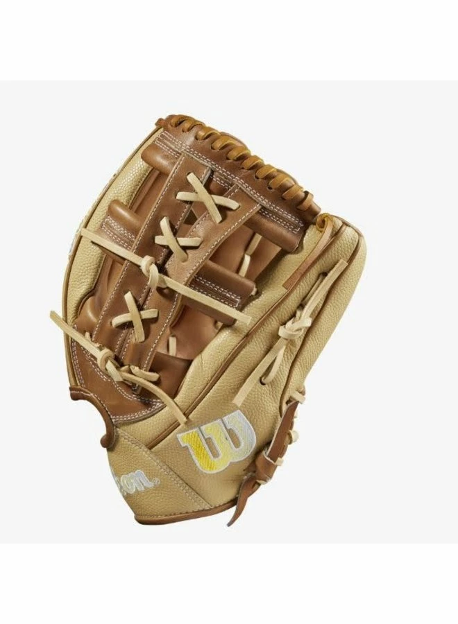 Gap welting – a piece of the Saddle Tan Pro Stock® leather palm folded between the index and middle fingers – allows for a deep, stable pocket to control the ball, and the Cross Web with 3X Lace can handle work all over the field. Gradient Bold Logos in Yellow and White deliver a fresh look, and Blonde SuperSkin™ reduces glove weight while repelling moisture so utility players can take the field in all weather conditions.
