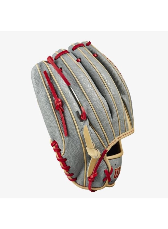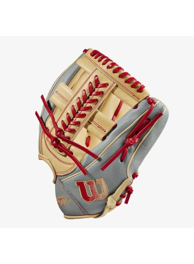 The Blonde Pro Stock® leather palm features a gap welting – a piece of the palm folded between the index and middle fingers – allowing for a deep, stable pocket. The glove’s Grey SuperSkin™ back reduces weight while improving durability, and gradient Bold Logos in Red and Blonde add to the modern look. At 11.75”, the A2000 1785SS offers the reach and control to make backhand plays at third or turn two up the middle.